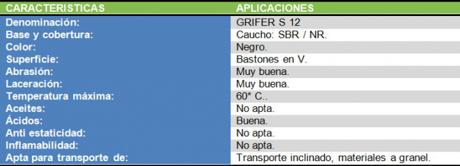 La superficie de carga provista de bastones a espina de pescado tipo Grifer S 12 permite el transporte de materiales a granel con pendientes variables de 30º a 40º tales como carbón, cemento, azúcar, harina, café, cereales, etc. Las características de los compuestos de caucho de la cobertura le otorga a la misma las mejores condiciones de resistencia a la abrasión y al corte, así como una excelente resistencia a la tracción y óptimo alargamiento. Las cintas Grifer S 12 son provistas con armaduras textiles de Nylon-Nylon o Poliéster-Nylon con el número y prestación de telas que requiera el transportador a equipar.