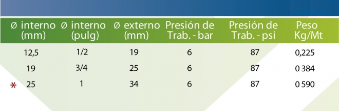 Impulsión de aire, agua y líquidos no corrosivos en general. Alta resistencia a los agentes atmosféricos. No se ablanda ni se endurece con las variaciones de temperatura.