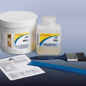 El ARC 855 puede usarse solo o en combinación con otros compuestos ARC. Este sistema de varias capas de recubrimiento provee un manteni miento preventivo de larga duración contra el desgaste. El compuesto de cerámica curado proporciona una resistencia química y contra la abrasión extraordinaria y posee un acabado brilloso