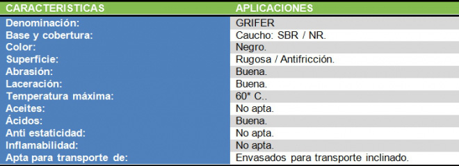 Cinta con cobertura superior corrugada, es ideal para el transporte de bolsas, cajas, embalajes. Su cobertura es anti abrasiva, con buena resistencia a la laceración y agentes atmosféricos. Inclinación máxima para el transporte en pendiente: 35º