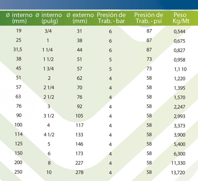 Refuerzo: Telas de fibras sintéticas impregnadas en compuesto de caucho más un espiral de alambre de acero de alta resistencia incorporado.