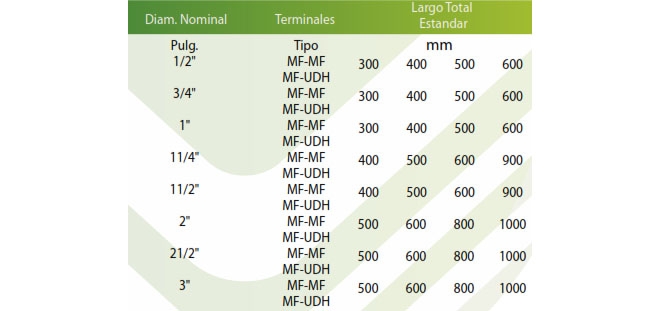 Caño flexible de acero inoxidable corrugado recubierto con una malla trenzada de acero inoxidable que proporciona gran flexibilidad y resistencia a la corrosión. Se suministran con terminales Tipo "MF" macho fijo rosca BSPT o tipo "UDH" unión doble hembra, rosca BSP, en acero al carbono.