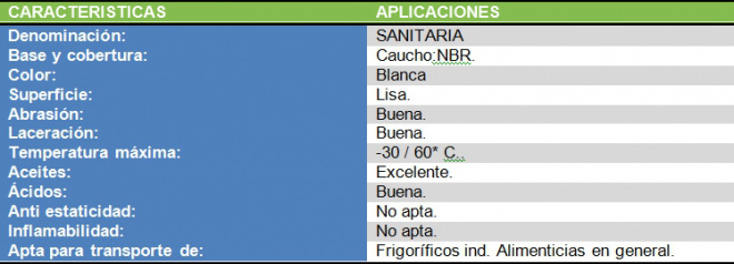 La formulación de sus compuestos de goma, su color blanco y su excelente resistencia a las grasas de origen animal y vegetal la hacen apta para el transporte de productos alimenticios, prestando su mejor servicio en industrias del rubro tales como frigoríficos, ingenios azucareros, procesadoras de pescado, etc.